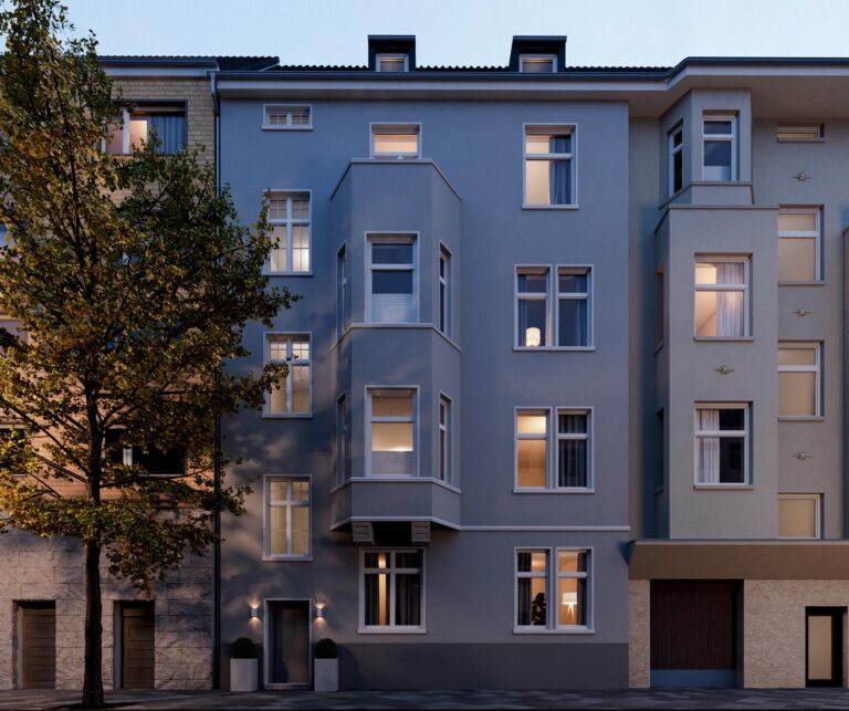 Das stattliche Mehrfamilienhaus mit sechs Wohneinheiten verteilt sich auf 5 Geschosse. Die für das Baujahr typische Fassade fügt sich perfekt in das Flair des Viertels ein. Das Altbautreppenhaus präsentiert sich mit all seinem Charme und vermittelt einen einladenden Eindruck. Das Treppenhaus sowie die Fassade werden noch neu gestaltet.